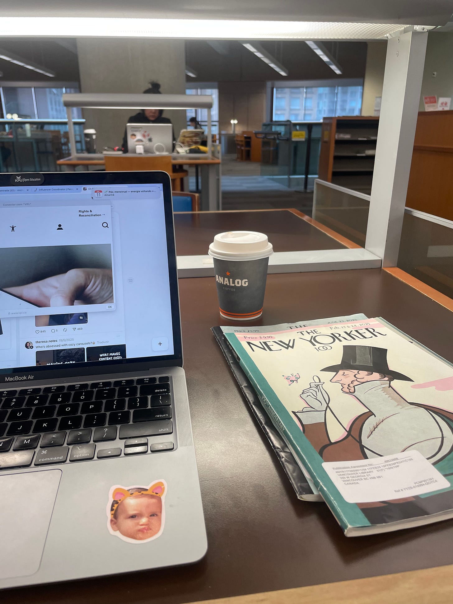 Subi alguns lances de escadas e me sentei em uma das mesas individuais para trabalho, no quarto andar. Era confortável, com boa iluminação e em um silêncio delicioso, não daqueles intimidadores, onde você fica neurótica com os barulhos do seu estômago, mas aquele silêncio bom, que dá vontade de fazer coisas. Existem tantos tipos de silêncio, né? Depois da maternidade, aprendi a valorizar cada um deles. Bem, uma vez posicionada, fui dar uma olhada nas prateleiras de livros que ficavam ali do lado e tive o prazer de pegar algumas edições da New Yorker. Não fiz mais que folheá-las, mas ainda assim, me senti feliz em tocá-las e colocá-las em minha mesa.
