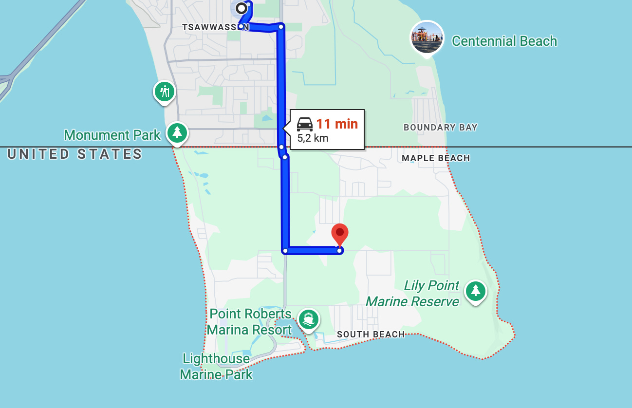 Bom, agora com as definições de cidade mais claras para essa imigrante que vos fala, aprendi que vivo em Delta. Tsawwassen é como se fosse um dos três bairros que compõem o município. Da minha casa, estou a 10 minutos de Point Roberts, nos EUA, 20 minutos de Vancouver e 40 minutos de downtown, que é o centro. Eu sei, não faz muito sentido, mas é que Point Roberts é literalmente isso aqui: